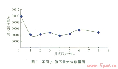 由位移矢量圖可見,井底壓力在0 MP。時(shí)位移變化最大,隨后開始減小,到5 MPa后又明顯增大,取出各pi值時(shí)最大位移量進(jìn)行比較有如圖7關(guān)系。
