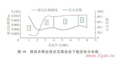 從圖上可見,在0l MPa兩種狀態(tài)中,塊體安全系數(shù)均小于20%,而塊體的安全系數(shù)在28 MPa幾種狀態(tài)下都超過78%,所以在這些壓力狀態(tài)下井壁更加穩(wěn)定。將最大位移與安全系數(shù)分布進(jìn)行耦合,得出煤層在低壓范圍內(nèi)最佳穩(wěn)定區(qū)間(10)。