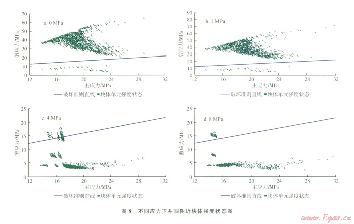 從圖7上可見,隨著pi值增大井壁附近最大位移逐漸減小,去除誤差影響,認(rèn)為隨著壓力增加,井底壓力對(duì)煤層井壁支撐作用加強(qiáng),而這種支撐作用保持一定水平,pi值在18 MPa范圍內(nèi),最大位移變化區(qū)間為0.0040.006 m,僅從這個(gè)角度講,只能說明整個(gè)塊體的位移分離情況,并不知道各個(gè)塊體是否已經(jīng)產(chǎn)生破壞,所以下面對(duì)各個(gè)狀態(tài)進(jìn)行定量判斷塊體單元強(qiáng)度情況。