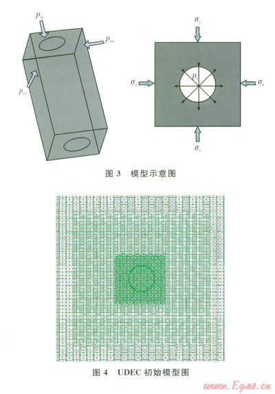 選取3號(hào)煤所處地層進(jìn)行分析。假設(shè)據(jù)地面深度為700 m,設(shè)邊長(zhǎng)為2 m的正方形作為研究對(duì)象,井眼尺寸為øl52.4 mm。為盡量研究關(guān)心區(qū)域,在建模過程中,井眼附近區(qū)域內(nèi)單元尺寸按真實(shí)節(jié)理大小設(shè)計(jì),其他區(qū)域采用雙倍節(jié)理間距設(shè)計(jì)。模型主要受應(yīng)力邊界條件σx、σy、σz,位移邊界x、y、z以及井眼有效壓力pi約束(3、4)(之所以用有效壓力pi,是為了簡(jiǎn)化分析因素,將各種井底因素簡(jiǎn)化為力學(xué)因素,不考慮滲流)。
