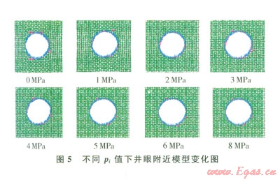 由圖5模擬結(jié)果顯示,改變井眼有效壓力值pi井眼形狀未發(fā)生較大變化,井眼形狀保持完好(圖中藍(lán)色區(qū)域),說明井壁未出現(xiàn)明顯垮塌或縮徑,只是局部塊體發(fā)生分離(圖中紅色區(qū)域),節(jié)理間距略有變化。