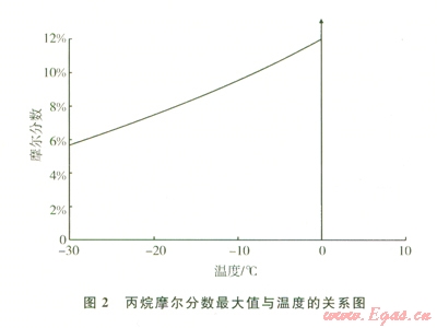 根據(jù)“壓縮天然氣汽車燃料推薦做法”(SAEJ1616-1994)的規(guī)定,新版ISO 15403-1-2006推薦在可能達(dá)到的最低環(huán)境溫度和最高操作(或儲(chǔ)存)壓力下,CNG中冷凝液態(tài)烴的總量應(yīng)不超過1%(摩爾分?jǐn)?shù))。壓力在6 000~10 000 kPa范圍內(nèi)要求冷凝液態(tài)烴總量不超過l%時(shí),不同溫度下CNG中相應(yīng)的最大丙烷和丁烷含量分別如圖2、3所示。