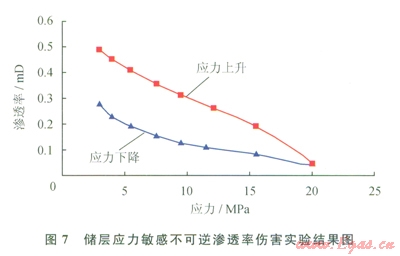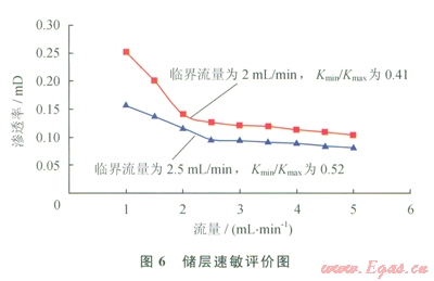 2)中等速敏和壓力敏感損害:儲層巖心液測速敏實驗表明,在1~5mL/min的測定流量范圍內,巖心的最小滲透率Kmin和最大滲透率Kmax分別為0.1029mD、0.2514mD和0.08mD、0.155mD,臨界流量為2~2.5mL/min,Kmin/Kmax分別為0.41、0.52,液測速敏損害較強(圖6)。儲層巖心應力敏感實驗結果由實驗結果可知:該地區(qū)低滲透儲層的應力敏感性為中等損害,滲透率由0.49mD降低為應力變化后的0.275mD,其應力敏感引起的不可逆滲透率損害率為43.9%(圖7)。
