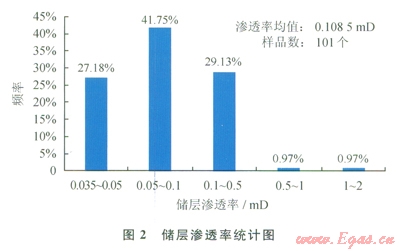 根據砂巖儲層孔隙度、滲透率與最大孔喉半徑的關系,該區(qū)塊儲層滲透率主要分布在0.035~0.5mD,占98.06%,主要孔喉半徑分布在O.1~0.8mm;儲層最大滲透率范圍在0.5~2mD,其對應的最大孔喉半徑范圍0.8~3.0mm,該儲層對滲透率貢獻率最大的孔喉半徑區(qū)間為0.1~0.8mm和0.8~3.0mm。