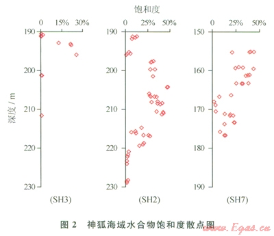圖2是神狐海域SH3、SH2和SH7站位現(xiàn)場測試的水合物飽和度散點(diǎn)圖。SH3站位含水合物層較薄,水合物集中分布在192~196m段,最高飽和度值出現(xiàn)在196m處,飽和度值為25.5%,與聲波曲線高值段相對應(yīng),含水合物層的最高聲速值為205lm/s。SH2站位含水合物層大約有30m厚,水合物集中分布在海底l90~220m,該站位水合物飽和度相對較高,超過l5%高飽和度水合物主要集中在197~220m段,飽和度值為15%~47%,平均為29%。該深度段的聲波速度值相對較高,含水合物層的最高聲速為2279m/s。SH 7站位水合物層大約有22m厚,水合物集中分布在海底l55~177m。與SH2站位相似,該站位水合物飽和度較高,水合物的分布主要分為2段,l55~164m為高飽和度值段,水合物的飽和度為25%~44%,平均為34%,該深度段的聲波速度值整體較高,最高聲速為2578m/s;而l66~177m深度段的水合物飽和度相對較低,飽和度值為3%~23%,平均為l4%,該深度段的聲波速度值有下降的趨勢,最高聲速為2256m/s。