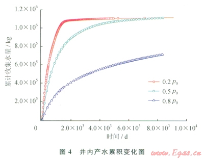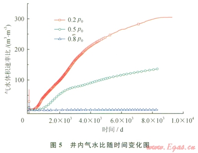 從上述研究成果町以得出,在0.2p0條件下,水合物藏中水合物全部分解,井內(nèi)收集到3.4×105m3的氣體。圖4為0.2p0、42℃,0.5p0、42℃,0.8p0、42℃這3種條件下,井內(nèi)收集水的累積變化圖。從圖4中可以看出,產(chǎn)水集中在開采前期1500d,后期產(chǎn)水速率小。在0.5p0、42℃,0.8p0、42℃條件下,也有較大量的水被收集,表明也有較大量的水合物被分解了。圖5為整個(gè)開采過(guò)程中3種條件下,井內(nèi)氣水比隨時(shí)間的變化圖。從圖5可以看出,0.2p0、42℃條件下,氣水比一直在增加,最大值達(dá)到304;而0.5p0、42℃條件下,氣水比增加緩慢,最大達(dá)到136;0.8p0、42℃條件下氣水體積比一直接近0,開采后期也沒有改善。可以看出,在井內(nèi)壓力高時(shí),井和物藏間的壓差不夠大,整個(gè)開采過(guò)程,分解后的自由氣并沒有大量流人開采井內(nèi)。可見減壓驅(qū)動(dòng)力對(duì)于分解后自由氣在井內(nèi)的收集非常重要。物藏和井之間壓差太小,自由氣一直留在物藏內(nèi),無(wú)法在井內(nèi)被收集。