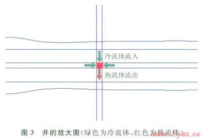 式中A1表示導(dǎo)熱面積0.4m2(井左右網(wǎng)格對(duì)井導(dǎo)熱距離大,其導(dǎo)熱熱流忽略);l表示導(dǎo)熱系數(shù),其中lrock表示地層骨架(沙石)導(dǎo)熱系數(shù),3.1W/(m·K),占0.6的空間,有效導(dǎo)熱系數(shù)為1.86W/(m·K),lrock表示水的導(dǎo)熱系數(shù)0.58W/(m·K),孔隙度為0.4,飽和度為0.5,有效導(dǎo)熱系數(shù)為0.12W/(m·K);DT表示井和其周圍網(wǎng)格間溫差,來(lái)自模擬結(jié)果文件;L表示導(dǎo)熱距離0.35m,井中心到上下網(wǎng)格中心距離。