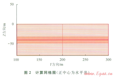 在Z軸方向(豎直方向),水合物層細(xì)分為Dz=0.2-1m的網(wǎng)格。而上下層在Z方向上,單個(gè)網(wǎng)格lm或2m,Z方向共離散成55個(gè)間隔。在Y方向(寬度方向),400m被分為3個(gè)網(wǎng)格,兩側(cè)網(wǎng)格均為l99.9m,中間網(wǎng)格為0.2m,用做開采井。X方向?yàn)?span lang="EN-US">1m單個(gè)網(wǎng)格??偩W(wǎng)格數(shù)為l65(55×3)。最頂層和最底層的6(3×2)個(gè)網(wǎng)格作為邊界網(wǎng)格(恒溫、恒壓),離散所得的網(wǎng)格如圖2所示。開采井在網(wǎng)格正中心,圖3為井的放大圖,圖3中示意了流體流向。井內(nèi)溫度壓力條件根據(jù)模擬需要進(jìn)行相應(yīng)設(shè)置。井溫度設(shè)定為42℃(恒溫),壓力設(shè)置為0.2P0、0.5P0、0.8P0 (恒壓)3個(gè)級(jí)別進(jìn)行模擬開采。