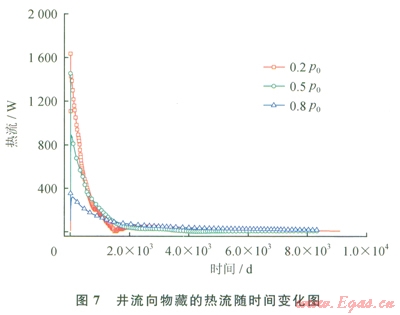 從圖9中可以看出,8500d內(nèi),井和周圍網(wǎng)格溫差平均值為30.3℃。因?yàn)樽笥揖W(wǎng)格中心和井網(wǎng)購(gòu)中心距離大,井對(duì)左、右網(wǎng)格的導(dǎo)熱熱流忽略不計(jì)。只考慮上、下網(wǎng)格,導(dǎo)熱距離0.35m。骨架有效導(dǎo)熱系數(shù)為1.86W/(m·K),水的有效導(dǎo)熱系數(shù)為0.12W/(m·K)。由式(4),骨架導(dǎo)熱功率64.4W,水導(dǎo)熱功率4.1W,所以總的導(dǎo)熱熱流為68.5W。