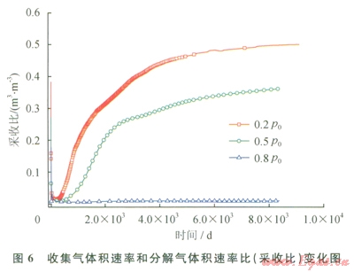 如果水合物已經(jīng)分解,分解氣體不能夠流入井內(nèi)被順利收集,那么這種技術(shù)就沒有任何經(jīng)濟(jì)價(jià)值和意義。因此井中的流體流動(dòng)對(duì)水合物的開采是非常重要的。圖6為3種開采條件下,井內(nèi)收集氣體積速率和水合物分解氣的體積速率比(采收比)隨時(shí)間的變化圖。在開采初期,水合物分解速率大,分解氣體積速率也大,而井內(nèi)收集速率較小,所以采收都比較低。而在開采后期,分解氣體積速率小,收集速率比較平穩(wěn),所以開采后期采收比根據(jù)井和物藏間壓差不同而變化較大。在0.2P0、42℃情況下,采收比在開采1000d左右增加到0.3,而0.5P0、42℃情況下,則在2000d左右才達(dá)到0.3,而0.8P0、42℃條件下,采收比始終接近于0。水合物藏總含氣量為6.8×105m3,0.2P0、42℃條件下,井內(nèi)氣體累積收集量為3.4×l05 m3,總采收率為0.5。當(dāng)氣體收集到2.1×105m3,總的采收率約為0.3,0.8P0,42℃條件下,總采收比接近0。由此可以看出,減壓驅(qū)動(dòng)力對(duì)采收比也有著非常大的影響。