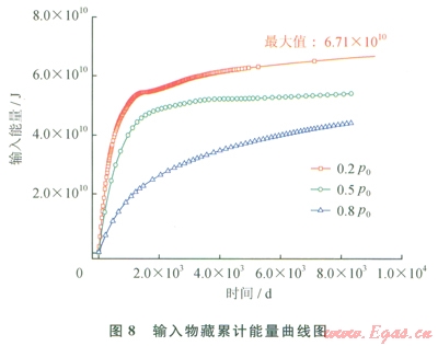用80m×400m×1m水合物藏開采模擬所得數(shù)據(jù),結(jié)合開采物藏和井的參數(shù),可計(jì)算減壓和加熱對(duì)水合物分解的貢獻(xiàn)。水合物藏中水合物總質(zhì)量為3.6×106kg。由式(2)可得,完全通過(guò)加熱熔化需要能量1.27×1012J。圖7為井流向物藏的熱流隨時(shí)間變化圖。對(duì)圖7熱流進(jìn)行積分,得到輸入物藏累計(jì)能量變化曲線(圖8)。在0.2P0、42℃條件下,輸人物藏的能量最大,為6.71×1010J。井內(nèi)溫壓條件為0.5P0、42℃時(shí),輸入物藏的能量為5.39×1010J,0.8P0、42℃時(shí),輸人物藏能量為4.39×1010J。由式(1)可得,在0.2P、42℃條件下,加熱分解了5.28%的水合物,其余的水合物由減壓驅(qū)動(dòng)力所分解。而在另外兩種井內(nèi)溫度壓力條件下,加熱分解的水合物量多一些,而減壓所分解的水合物量相比更少一些。