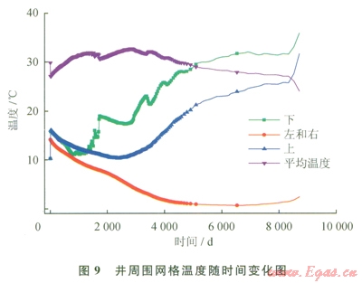 流入井內(nèi)的熱流可以通過(guò)手動(dòng)計(jì)算得到印證。下面只對(duì)0.2P0、42℃條件下數(shù)據(jù)進(jìn)行計(jì)算。圖9為0.2P0、42℃條件下,井周圍網(wǎng)格溫度隨時(shí)間變化圖。井網(wǎng)格和其相連4個(gè)網(wǎng)格間溫度差及其平均值都列于圖9中,井溫度為定值42℃,平均溫差由如下式定義: