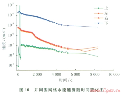 孔隙滲透換熱能夠?qū)⒛芰總魅宋锊亍Dl0為井周圍網(wǎng)格水流速度隨時(shí)間的變化圖。左、右和下表示網(wǎng)格中水流向井內(nèi),而上則表示井從上流入其正下方網(wǎng)格。圖10中下表示正上方網(wǎng)格流人下方井內(nèi)水流速率,也就是圖10中“下”表示的曲線,該速率遠(yuǎn)高于其他3個(gè)方向的速率。圖ll為井周圍網(wǎng)格中氣體速率隨時(shí)間變化圖。同樣是上方網(wǎng)格流向正下方井內(nèi)氣體速率最大,也就是圖ll中“下”表示的曲線。氣流和水流的速率數(shù)量級(jí)均為l04m/s。由于甲烷氣導(dǎo)熱系數(shù)約為0.03W/(m·K),遠(yuǎn)低于液態(tài)水的導(dǎo)熱系數(shù),其換熱可以不計(jì)算,這里只計(jì)算水的對(duì)流。