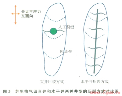 蘇里格氣田直井開(kāi)發(fā)方式下采收率較低,除了井網(wǎng)控制程度的影響外,阻流帶造成鉆遇砂體動(dòng)用不完善也是主要原因之一,而水平井可以克服“阻流帶”的影響,再通過(guò)多段壓裂,可有效提高鉆遇儲(chǔ)層的動(dòng)用程度(圖3)。