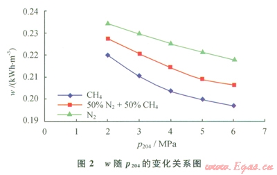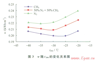 當(dāng)進口天然氣壓力(P101)為5MPa、LNG儲存壓力(P104)為2MPa、氣體制冷劑膨脹前壓力(P204)為5MPa時,在一定范圍內(nèi)改變氣體制冷劑膨脹前預(yù)冷溫度(t206),通過HYSYS軟件模擬計算可得到產(chǎn)品LNG的單位能耗(w),進而得到w隨t206的變化關(guān)系(圖3)。由圖3可知,產(chǎn)品LNG單位能耗先隨制冷劑膨脹前預(yù)冷溫度的增加而降低,后又隨之增加而增加。這是因為膨脹前溫度較低時,流程的熱負(fù)荷較大,造成制冷劑流量上升,壓縮機功耗隨之增加,從而導(dǎo)致產(chǎn)品LNG能耗增加。膨脹前溫度較高時,膨脹后的溫度也較高,引起膨脹后壓力自調(diào)節(jié)降低壓力,壓縮機功耗隨之增加,從而導(dǎo)致產(chǎn)品LNG能耗增加。故而制冷劑存在一個最優(yōu)膨脹前壓力,南圖3可知,t206為-25℃、-30℃、-35℃時分別是CH4、50%N2+50%CH4、N2制冷劑的最優(yōu)膨脹前預(yù)冷溫度。