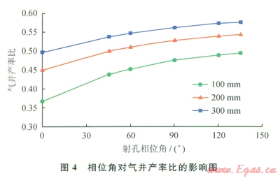 模擬研究認(rèn)為孔密超過l6孔/m時(shí),氣井產(chǎn)能增加幅度有限;相位角對(duì)產(chǎn)能的影響很明硅,作為酸壓(化)井,60°和l20°相位角比較合適,120°產(chǎn)能最高(圖4);產(chǎn)能隨孔眼深度的增加而增加,當(dāng)孔深增加到一定程度時(shí),氣井產(chǎn)能增加的幅度明顯變緩;氣井產(chǎn)能對(duì)孔徑十分敏感,產(chǎn)能隨孔徑增大增加明顯,在孔眼穿透污染帶以后這種影響更為顯著。