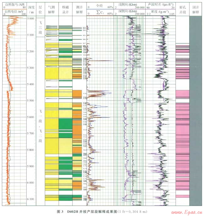 結(jié)合單井井身結(jié)構(gòu)、同井質(zhì)量等因素,具體優(yōu)化氣井投產(chǎn)層段。如D402H井鉆遇氣層750m,含氣井段跨度l055.3m,固井質(zhì)量?jī)?yōu)秀。考慮該井井段跨度大,飛三段氣層有鄰井控制,為降低投產(chǎn)作業(yè)難度和節(jié)約投資,對(duì)于氣層相對(duì)分散的飛三段氣層(厚度33m,跨度ll0m)不射孔(圖3)。通過投產(chǎn)層段優(yōu)化,在不影響單井產(chǎn)能等開發(fā)指標(biāo)的前提下,合理避射氣層,降低了投產(chǎn)作業(yè)費(fèi)用。