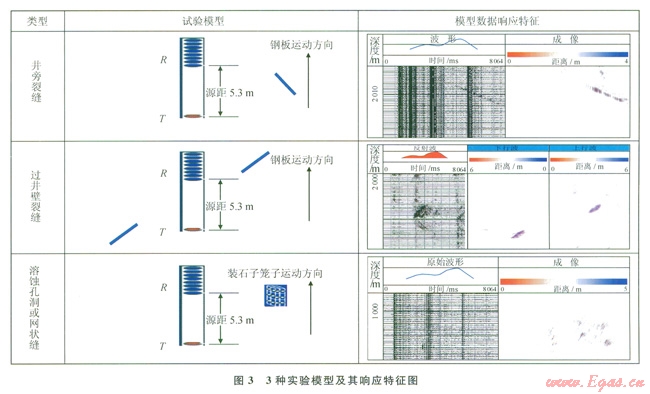 實(shí)驗(yàn)過程中用2m×lm×1mm的鋼板模擬裂縫,用2m×lm×0.5m的鐵制網(wǎng)狀籠子裝上大小不等的鵝卵石模擬溶蝕孔洞,把儀器水平放入水中,保持儀器在水中靜止,模型做勻速運(yùn)動(dòng),記錄一組數(shù)據(jù),據(jù)此做不同類型的模擬實(shí)驗(yàn),得到各種響應(yīng)特征。圖3是在消聲水池做的3類實(shí)驗(yàn)?zāi)P图捌漤憫?yīng)特征圖。圖中井旁裂縫,鋼板中心位置距儀器3m,與儀器夾角為-20°(逆時(shí)針為負(fù),順時(shí)針為正),儀器源距為5.3m,從原始波形圖上看,反射波的傾斜同相軸非常明顯,從模型來分析這種情況只有下行波,不存在上行波,因此,在處理過程中波分離后直接進(jìn)行成像,沒有進(jìn)行上下行波分離,得到一組單邊的條帶狀同相軸,其形狀、走勢、夾角與模型基本一致,同相軸的中點(diǎn)大約為3m與鋼板距儀器的距離一致;過井壁裂縫,兩塊一樣的鋼板分別放在儀器兩側(cè)與儀器的夾角為20°,兩塊板中點(diǎn)都距儀器3m,從原始波形上看有兩組不同走勢的反射波,從理論分析這種情況會出現(xiàn)上下行反射波,對其進(jìn)行處理并雙邊成像,可以看出在上下行反射波成像圖上各有一組條帶狀的同相軸,且兩組同相軸在一條直線上;孔洞或網(wǎng)狀縫,用三角鐵焊成2m×1×0.5m的長方形骨架,然后用的鐵絲網(wǎng)把6個(gè)面封好,里面裝上鵝卵石來模擬溶蝕孔洞,放置中心距儀器3m,從理論分析這種模型的反射是雜亂無章的,處理過程中在波分離完直接對其進(jìn)行了成像沒有進(jìn)行上下行波的分離,從成像圖上看呈雜亂無章的斑點(diǎn)狀。