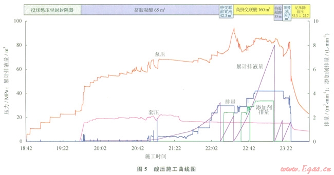 利用實(shí)驗(yàn)確定了典型地質(zhì)體的響應(yīng)特征,以該響應(yīng)特征為依據(jù)對實(shí)際井?dāng)?shù)據(jù)進(jìn)行解釋,建立一系列的特征圖集或解釋圖版,在后續(xù)生產(chǎn)中可以用圖版對測井資料進(jìn)行解釋[12-13]。圖4是塔里木油田A井的一段碳酸鹽巖段綜合解釋成果圖。從圖中可以看出XX20~XX30m井段,成像測井在XX26m解釋一條40cm高的裂縫,孔隙度小于1.8%,電阻率大于1000W·m,綜合評價(jià)為Ⅲ類儲集層,開井流動(dòng)曲線呈一條直線,關(guān)井壓力恢復(fù)緩慢,壓力歷史曲線反映測試層為特低滲透性儲集層,僅從常規(guī)分析這類儲集層即使酸化壓裂也不會獲得工業(yè)油氣流。而對應(yīng)遠(yuǎn)探測成像圖上可以看出在XX20~XX28m距井壁3~10m的地方發(fā)現(xiàn)反射信息比較明顯,為雙邊成像,同相軸幾乎為直線,但兩側(cè)的同相軸延長線在在一條線上,裂縫角度較高,根據(jù)圖版可以評價(jià)為高角度井旁裂縫。建議中國石油塔里木油田公司勘探公司進(jìn)行試油,該建議被采納,酸壓后6mm油嘴日產(chǎn)氣l0多萬立方米、油l0多立方米。從圖5酸壓施工曲線分析,擠膠凝酸注入過程壓力平穩(wěn)上升,人造裂縫正常延伸,沒有溝通儲層縫、洞的跡象;再次擠膠凝酸后,壓力有明顯下降,說明溝通了縫洞系統(tǒng)。從圖6裂縫導(dǎo)流能力曲線圖上分析在裂縫延伸方向8m處遇到溶洞區(qū),在36m處穿過溶洞區(qū)。證實(shí)遠(yuǎn)探測聲波反射波成像解釋是正確的。