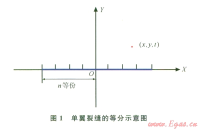 如圖l所示,將裂縫的兩翼分別分成咒單元,每一單元視為一個(gè)點(diǎn)匯進(jìn)行處理。以第j單元的中心坐標(biāo)來(lái)表示左翼裂縫上的第j個(gè)點(diǎn)匯的坐標(biāo)(x1j、y1j):