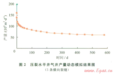 某氣藏壓裂層有效藏厚度8m,地層滲透率為10mD,地層溫度80℃,井筒半徑0.1m,水平井段長(zhǎng)度400m;原始地層壓力27.56MPa,井底流壓為23.56MPa;氣體黏度為0.022mPa·S,氣體壓縮因子為0.957。壓裂形成5條橫向裂縫,各條裂縫長(zhǎng)度200m,裂縫滲透率50D,支撐裂縫寬度0.003m。模擬計(jì)算結(jié)果如圖2、3所示。