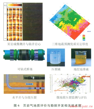 在頁巖氣勘探開發(fā)前,中國已在沁水盆地、鄂爾多斯盆地、四川盆地成功實現(xiàn)了煤層氣和致密砂巖氣的規(guī)模化工業(yè)生產(chǎn),基本明確了非常規(guī)天然氣的地質特征、富集規(guī)律,基本形成了一套有效的地質評價、富集區(qū)選擇方法,初步摸索出了一套有效的勘探開發(fā)技術。在頁巖氣勘探開發(fā)進程中,中國充分借鑒、學習北美的成熟技術[10],充分利用中國在常規(guī)及其他非常規(guī)油氣勘探開發(fā)中形成的先進有效技術,在致力于頁巖氣地質理論研究的同時,初步探索形成了多項頁巖氣勘探開發(fā)適用技術(圖6),包括頁巖氣形成與富集特征研究方法、頁巖氣地質評價與選區(qū)方法、頁巖氣資源評價方法、頁巖氣測井識別與處理解釋技術、地震采集處理與儲層識別預測技術、水平井鉆完井技術、水平井分段體積壓裂工藝技術、頁巖儲層改造配套工具、儲層改造低摩阻與速溶滑溜水體系、多種裂縫監(jiān)測診斷評估技術等。