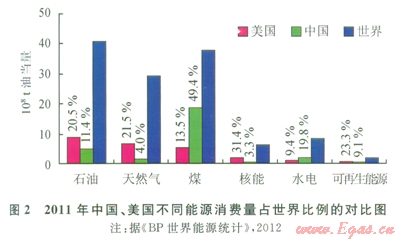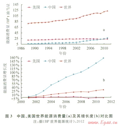 中國社會經(jīng)濟持續(xù)高速發(fā)展,能源需求量屢創(chuàng)新高。2011年中國一次能源生產(chǎn)總量為2 446.1×106t油當量,一次能源消費量為2613.2×106t油當量[3]。2000—2011年世界平均能源消費量增長為31.2%,而中國能源消費量則增長了158.6%,占世界總能源消費增長量的21.3%,超過了美國等發(fā)達國家(圖3)。但中國能源資源量仍非常低,尤其是人均油氣資源量僅占世界平均水平的6%。中國1993年首次成為石油凈進口國,2006年天然氣也跨人凈進口國之列[5]。中國石油對外依存度由l993年的l.2%飆升到2011年的58%,天然氣對外依存度由2006年的0.8%迅速攀升至2011年的23%,成為全球能源市場中最重要的進口國。在天然氣需求中,近年來(2006 2011年)盡管中國的天然氣產(chǎn)量每年平均增長l3%以上,成為全球天然氣產(chǎn)量增長最快的國家之一,但總量還是非常少的。2011年中國天然氣產(chǎn)量為1025×108m3,天然氣消費量同期年均增長量超過18%,2011年中國天然氣消費量達1307×108m3。據(jù)預測,到2020年中國天然氣年均消費量仍將以19%的復合年增長率遞增,在中國能源結構中的比例將由2011年的5%提高到l0%~l 5%,而屆時中國天然氣產(chǎn)量僅為2000×108m3左右。