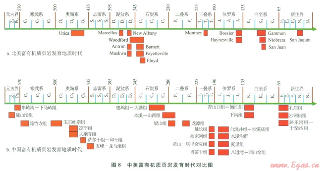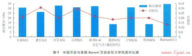 在地質特征上,作為有勘探開發(fā)遠景的含氣頁巖儲層既要有產(chǎn)氣潛力大的物質基礎——高質量儲層(RQ),也要是能進行有效壓裂的目標——良好的鉆完井地層(CQ)。有機質含量高的富含有機質頁巖是在特殊條件下形成的[2],這種特殊的條件使得所有頁巖氣儲層都有其獨特性(圖7) [6-7],即便是同一套頁巖儲層的地質特征在縱橫向上也往往會有非常明顯的變化。每一頁巖儲層要實現(xiàn)工業(yè)化規(guī)模開發(fā)都需要花費一定的時間對其地質特征進行認識,摸索適應的工程技術。從對比研究的結果可知,與北美地臺頁巖氣儲層相比,中國頁巖氣形成與富集地質條件非常復雜,除頁巖沉積總面積可能相當外,其他條件都相差較遠。美國產(chǎn)氣頁巖主要是海相沉積,而中國除海相頁巖外,還有較為發(fā)育的海陸過渡相和陸相頁巖(圖8)。美國頁巖氣主要產(chǎn)白上古生界一中生界,中國白元古界到新近系都有頁巖發(fā)育[1]。美國頁巖熱(R。)為1.0%~3.5%,處在生氣高峰期,中國海相頁巖R。為2.3%~5.1%,為高——過成熟熱裂解成氣階段,陸相頁巖R。為0.4%~l.2%,處于低熟一成熟階段,以生油為主,局部生氣。北美地臺構造穩(wěn)定,斷裂少,頁巖自沉積、成巖、成氣以來,除有一定抬升外,很少有大的構造改造,中國構造背景總體處在活動性較強的區(qū)域,斷裂發(fā)育,大部分頁巖都經(jīng)歷了強烈的后期多次改造,南方海相頁巖大面積出露。另外,從圖9中可明顯看出,中國頁巖儲層楊氏模量較低、泊松比高,巖石脆性指數(shù)低于美國頁巖儲層,可壓性差。