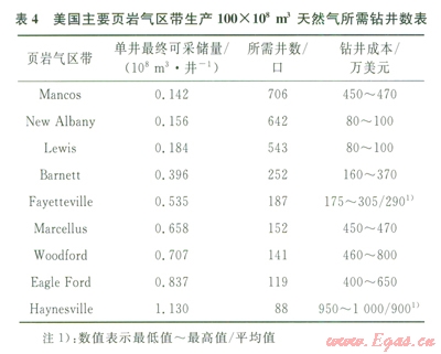 頁巖氣井生產(chǎn)具有單井產(chǎn)量低、遞減快等顯著特征,需要大量鉆井才能實現(xiàn)頁巖氣規(guī)模產(chǎn)量與穩(wěn)產(chǎn)(表4)。因此,頁巖氣勘探開發(fā)投資巨大,成本高,一般企業(yè)承擔不了如此巨大的投入風險。美國的頁巖氣勘探開發(fā)是在較為完善的天然氣管網(wǎng)和發(fā)育的消費市場基礎上,不斷改善技術、優(yōu)化作業(yè)流程、降低成本,才使其勘探開發(fā)成本明顯偏高,短期內根本無利可圖。四川盆地頁巖氣勘探開發(fā)試驗區(qū)統(tǒng)計結果表明,目前該試驗區(qū)頁巖氣水平井所需費用均超過4000萬元(人民幣),有的甚至達到7000萬元(人民幣),單井頁巖氣產(chǎn)量僅1.0×104~15.0×104m3/a,單井可采儲量為0.2×108~0.5×108m3,其虧損明顯。況且中國頁巖的賦存地質條件比美國復雜,頁巖氣勘探開發(fā)成本本身就可能會高于美國。