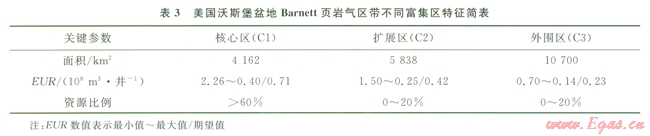 更為重要的是每一個成功的頁巖氣田從發(fā)現(xiàn)到工業(yè)化規(guī)模開發(fā)都需要經(jīng)歷“點上發(fā)現(xiàn)、面上評價、落實核心區(qū)、拓展規(guī)模開發(fā)”4個階段。與常規(guī)油氣資源勘探開發(fā)不同,頁巖氣首先是在遠景區(qū)帶評選的基礎上,通過l~2口或更多一點的鉆井工作,驗證貞巖氣的存在,實現(xiàn)點上發(fā)現(xiàn);再以數(shù)口至數(shù)10口評價井鉆探,對整個頁巖氣區(qū)帶開展面上評價,落實資源規(guī)模,分析資源分布規(guī)律,劃分不同資源豐度富集區(qū);隨后進行富集區(qū)綜合評價,開展先導試驗井鉆探,評價單井產(chǎn)能,總結高產(chǎn)富集規(guī)律,確定核心區(qū);最后以核心區(qū)為重點,實現(xiàn)工業(yè)化規(guī)模開發(fā),以此為基礎逐漸拓展,最終實現(xiàn)頁巖氣區(qū)帶整體開發(fā)。頁巖氣形成與富集機理特殊,一般大面積連續(xù)分布,資源富集程度總體較低,核心區(qū)為資源相對富集區(qū)。一個頁巖氣區(qū)帶中,核心區(qū)范圍不大,但所擁有的資源可占整個頁巖氣區(qū)帶的60%以上[6-7](表3),單井最終可采儲量(EUR)高,核心區(qū)內的頁巖氣井中的干井、低產(chǎn)井比例不足4%。因此,核心區(qū)的確定成為一個頁巖氣區(qū)帶成功的關鍵。中國頁巖氣勘探開發(fā)處于起步階段,資源潛力尚未完全落實,遠景頁巖氣區(qū)帶尚未確定,核心區(qū)的確定目前更無從談起。