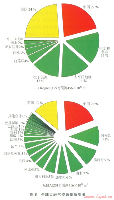 頁巖氣在中國雖顯些許陌生,但目前在中國陸上已發(fā)現(xiàn)從前寒武紀到新生代均有豐富的富有機質頁巖發(fā)育(圖4)[5],初步預測中國具有豐富的頁巖氣資源量。美國學者(Rogner,1997) [6-7]、美國能源信息署(EIA,2011) [8]預測全球頁巖氣資源量為456×1012~716×1012m3 (圖4),接近或超過了全球常規(guī)天然氣資源量(471×1012m3)。其中所預測的中國頁巖氣資源量為l00×1012~l44.4×1012m3,占世界頁巖氣總資源量的20%左右(圖5)。2005年以來,中國機構或學者借鑒北美成功經(jīng)驗,加快頁巖氣地質認識,強化頁巖氣勘探開發(fā)技術攻關,通過廣泛開展中國頁巖氣地質評價與典型區(qū)塊的勘探開發(fā)先導試驗,在四川、鄂爾多斯等盆地和重慶黔江、湖南漣源等地區(qū)的頁巖氣勘探開發(fā)中相繼取得突破,證實了中國頁巖氣(資源)的廣泛存在,具良好的勘探開發(fā)前景。利用露頭地質調查、探井及實驗測試等取得的實際數(shù)據(jù),預測中國頁巖氣地質資源量為57×102~224×1012m3,技術可采資源量為10.3×1012~47×1012m3 (表1) [5]。2012年中國政府已依據(jù)中國豐富的頁巖氣資源量、勘探開發(fā)先導試驗的可喜成果,制定了雄心勃勃的《中國頁巖氣“十二五”發(fā)展規(guī)劃》:2015年中國頁巖氣產(chǎn)量達到65×108m3,2020年力爭實現(xiàn)頁巖氣產(chǎn)量600×108~800×108m3[9]。