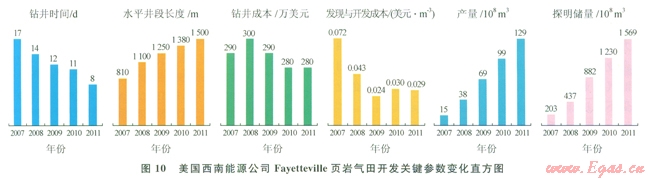 頁巖氣本身是潔凈能源,毋庸置疑,但頁巖氣在勘探開發(fā)巾會引發(fā)嚴重的環(huán)境污染問題也不應回避。美國有輿論指出頁巖氣開采已產(chǎn)生了明顯的環(huán)境污染,在美國的一些地方,已爆發(fā)多起抗議由頁巖氣勘探開發(fā)導致的水源污染、房屋損害等事件。歐洲因擔心頁巖氣勘探開發(fā)存在環(huán)境隱患而叫停了多個頁巖氣項目,越來越多的國家正在由于對環(huán)境的擔憂而不鼓勵頁巖氣發(fā)展[13]。頁巖氣勘探開發(fā)可能造成的環(huán)境污染包括勘探開發(fā)中大量占有土地對地表的破壞、大量鉆井液與壓裂液的用水與排放對水資源的過度使用與污染(表5)、烴類氣體遺散及其他有害物質的排放對大氣及土地等的污染。大量占有土地、鉆井液與壓裂成功實現(xiàn)了頁巖氣大規(guī)模商業(yè)性開采。據(jù)美國西南能源公司2007—2011年對Fayetteville頁巖氣區(qū)帶的開發(fā)統(tǒng)計,通過不斷的技術進步和優(yōu)化作業(yè)流程,鉆井時間減少了52%以上,水平井段長度增加了84%以上,產(chǎn)量、儲量均提高了7倍以上,但鉆井成本基本保持不變,發(fā)現(xiàn)和開發(fā)成本大幅度降低(圖10) [2],盡管如此,該區(qū)帶所有頁巖氣井,仍有80%處于虧損或無利可盈狀態(tài),只有20%的井有盈利狀態(tài)。中國頁巖氣勘探開發(fā)剛駛人工業(yè)化試驗發(fā)展道路,以地質評價、資源落實、技術積累為主,頁巖氣鉆井、儲層改造技術還不成熟,工具、工藝不配套,特別是施工工具、裂縫監(jiān)測等工具與技術尚需進口,同時,盡管中國的天然氣市場需求旺盛,但管網(wǎng)建設還不成熟且分布不均,使中國頁巖氣液的用水在中國將是更為嚴峻的環(huán)保挑戰(zhàn)。在中國南方地少人多、地貌以丘陵、山地為主,頁巖氣井場往往會臨近村舍,人口密集,且取水、排液主要以灌溉及飲用水源為主,這將使得頁巖氣在鉆井、儲層改造中面臨嚴峻的噪音消除、鉆井液與壓裂液處理及交通設施協(xié)調的壓力。大量土地占有,會造成地表植被破壞,大規(guī)模水力壓裂會破壞巖層穩(wěn)定性,二者并存將會增加山體滑坡發(fā)生的町能性。在中國北方,尤其是兩北地區(qū),干旱缺水現(xiàn)象較為突出,在較短的時間內消耗大量的水,會給當?shù)厝诵笥盟凸I(yè)用水帶來影響。另外,水力壓裂中大量消耗和陶粒、石英砂及KC1等也是寶貴的天然資源。