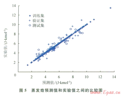 化合物的數(shù)目表明了方程式數(shù)目,而分子描述符的數(shù)目則表明了系數(shù)數(shù)目。因此,化合物數(shù)目超出分子描述符數(shù)目的比率越小,ANN就能在“訓(xùn)練”集中表現(xiàn)得越好。不過,對不在“訓(xùn)練”集內(nèi)的化合物來說,以這種方法構(gòu)建的ANN無法保證其預(yù)測水平。舉例來說(如表l所示),對于所構(gòu)建的蒸發(fā)焓或燃燒焓模型而言,“測試”集的平均相對誤差遠(yuǎn)遠(yuǎn)大于“訓(xùn)練”集的平均相對誤差。解決此問題的一個可能方案是采用PCA[8]:用PCA來處理描述符,然后找到得分,取前30列的得分(含上述信息99%的內(nèi)容),最后按照上述步驟構(gòu)建一個新的ANN。
