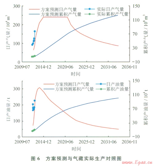 將相態(tài)恢復研究成果運用于氣藏模擬和方案預測中,氣井的產(chǎn)氣量、產(chǎn)油量、井l:3壓力等關鍵生產(chǎn)指標能夠得到較好擬合,在此基礎上建立氣藏預測模型預測氣藏產(chǎn)量,產(chǎn)氣量和產(chǎn)油量與實際吻合程度較高,油氣比基本吻合(圖6),高壓物性實驗、常規(guī)凝析氣藏類型判別與生產(chǎn)靜動態(tài)特征相結合的氣藏類型判別方法和相態(tài)恢復理論確定的氣藏類型是正確的、預測的凝析油含量是可靠的。