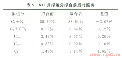 根據(jù)相態(tài)恢復理論,利用數(shù)值模擬軟件Eclipse中的高壓物性分析模型(PVTi),選取取樣時間早、相平衡較好的Xl2井的高壓物性實驗數(shù)據(jù)進行相態(tài)恢復。首先,對原始PVT數(shù)據(jù)進行模擬形成臨界參數(shù)場;然后,在目前壓力下,向平衡凝析氣中逐漸加入少量平衡油,再計算露點壓力,若計算的露點壓力低于地層壓力,則繼續(xù)在新的露點壓力下加入該壓力下的平衡油,直到露點壓力恢復到原始地層壓力?;謴偷皆嫉貙訅毫ο碌牧黧w組分,可以代表原始氣藏條件下的流體。相態(tài)恢復前后對照表表明,相態(tài)恢復后潛在凝析油含量C5+提高了1.75%,凝析油含量達到2499/m3(表5)。通過相態(tài)恢復模擬飽和凝析氣藏地層流體高壓物性特征,為開發(fā)技術政策制定和氣藏動態(tài)預測奠定了基礎。