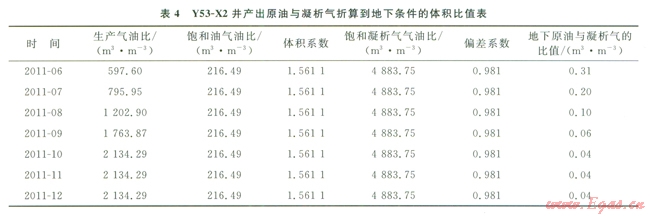 選取產(chǎn)油量最高的Y53-X2氣井進行分析,該井投產(chǎn)第一個月,平均日產(chǎn)氣2.04×104 m3,平均日產(chǎn)油35.27t,油氣比達到l7.29t/104m3,產(chǎn)出油密度0.8055g/cm3,含蠟量l3.63%,屬于原油。在實驗室測得Y53-X2井原始地層條件下飽和油的氣油比為216.49m3/m3,飽和凝析氣氣油比為4883.75 m3/m3,結合實際生產(chǎn)過程中產(chǎn)出流體的油氣比,計算該井不同時間產(chǎn)出天然氣與產(chǎn)出原油在地下的體積比(表4),結果表明產(chǎn)出流體中原油的比例迅速降低,表現(xiàn)為局部聚集原油的特征。Y53-X2井采氣曲線也表明隨著生產(chǎn)的進行,產(chǎn)出原油迅速下降,該井投產(chǎn)279d后,氣產(chǎn)量基本保持2×104m3/d,油產(chǎn)鰱從初期的45t/d降至2.0t/d(圖5),油產(chǎn)量及油氣比迅速下降,同樣說明井底附近原油有限。