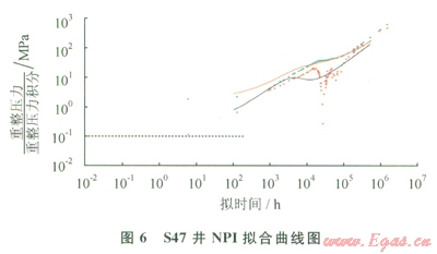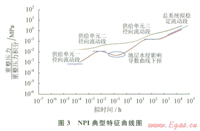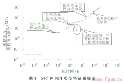 此外,S47井典型曲線分析也表明(圖4),該裂縫系統(tǒng)存在多個儲集體,不同連通范圍在NPI曲線上均有特征反映,且明顯可以發(fā)現(xiàn)由于地層水侵影響,造成NPI導(dǎo)數(shù)曲線異常下掉,與前面理論研究認(rèn)識一致。