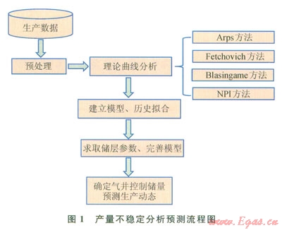 隨著氣井生產(chǎn)動態(tài)分析技術(shù)的不斷發(fā)展,逐漸形成了以生產(chǎn)數(shù)據(jù)為分析對象,對氣井進行生產(chǎn)分析、評價和預(yù)測的新方法,稱為產(chǎn)量不穩(wěn)定分析法。該方法以Arps產(chǎn)量遞減分析、Fekovich曲線擬合分析、Biasingame現(xiàn)代遞減分析、NPI重整壓力積分曲線分析為基礎(chǔ)[10-13],綜合考慮儲滲特征、流體物性等情況,開展各種典型曲線、生產(chǎn)歷史曲線的擬合分析,不斷修正模型參數(shù),最終確定氣井生產(chǎn)動態(tài)模型,實現(xiàn)動態(tài)儲量計算和生產(chǎn)分析預(yù)測,分析流程如圖1所示。