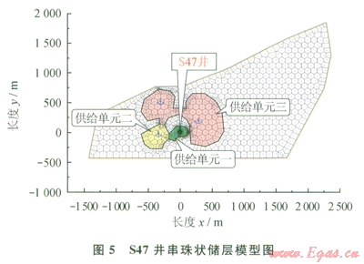 綜合地質(zhì)、生產(chǎn)動態(tài)以及典型曲線特征分析,診斷S47井裂縫系統(tǒng)存在3個儲集體,可以采用串珠狀儲層模型進行動態(tài)儲量計算分析。