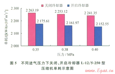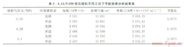 2)結(jié)合現(xiàn)場條件,對L-12/5-250型壓縮機(jī)第二、四級級間回氣管上加裝冷卻器后,在0.35、0.38、0.40Mpa,3種進(jìn)氣壓力下取得的對應(yīng)節(jié)能比分別為3.87%、4.04%、3.96%,驗證了該節(jié)能技術(shù)的可行性。