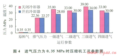 從表2的數(shù)據(jù)可看出,當(dāng)進(jìn)氣壓力為0.35 MPa時開啟冷卻器后壓縮機(jī)一級進(jìn)氣溫度由35℃降低到28℃,溫度下降了7℃,其他參數(shù)對比分析如圖4所示??傊诓煌M(jìn)氣壓力下,開啟冷卻器后壓縮機(jī)各級進(jìn)氣溫度都有所下降,對第二、四級級間回氣的冷卻取得了降低壓縮機(jī)進(jìn)氣溫度的效果。