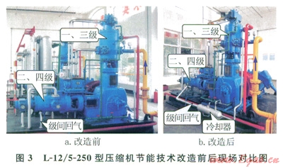 基于上述的節(jié)能技術(shù)原理,由于現(xiàn)場條件的限制,本次改造僅僅在L-12/5-250型壓縮機(jī)第二、四級級間回氣管線上加裝了一套冷卻器,冷卻器換熱面積為1.5,改造前后現(xiàn)場如圖3所示。為了系統(tǒng)分析節(jié)能改造的節(jié)能效果,在不改變冷卻系統(tǒng)和壓縮機(jī)系統(tǒng)其他設(shè)備參數(shù)的條件下,通過系統(tǒng)原有壓力、溫度、氣量、電耗等記錄儀表,分別測試了原料氣進(jìn)氣壓力為0.35、0.38、0.40MPa下關(guān)閉和開啟冷卻器時壓縮機(jī)的運(yùn)行參數(shù)和能耗,相關(guān)數(shù)據(jù)見表1、2。
