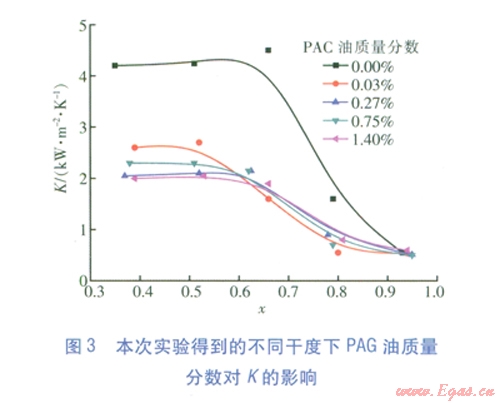 在設(shè)定實驗條件下得到,小同工質(zhì)干度下PAG油質(zhì)量分數(shù)對K的影響(見圖3)。由圖3可知,與無油工況相比,含油工況的K明顯下降。對于無油工況,在K急劇變化處干涸發(fā)生,并隨著工質(zhì)干度的增加,與含油工況的K差距縮小,最終趨于一致。