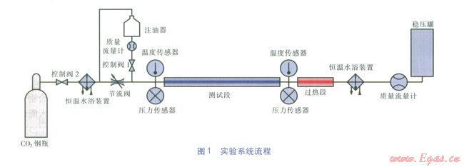 為了測試C0:一PAG油混合物(以下簡稱混合物)水平光滑管內(nèi)流動沸騰換熱特性,筆者設(shè)計搭建了實驗臺(見圖l)。實驗臺采用開式系統(tǒng),C02從鋼瓶中流出進入恒溫水浴裝置進行溫度調(diào)節(jié)和控制,模擬C02制冷系統(tǒng)中氣體冷卻器出口狀態(tài)。通過節(jié)流閥對C02進行流量控制,并使節(jié)流閥出口處的C02以液霧形式出現(xiàn)。在節(jié)流閥出口設(shè)置注油器,通過管道連接節(jié)流閥入口和出口,產(chǎn)生壓差,連同重力作用,注油器內(nèi)的潤滑油可連續(xù)注入節(jié)流閥出口管內(nèi),并與C02充分混合。注油器出口安裝流量計,以測量潤滑油注入流量,控制閥1可調(diào)節(jié)PAG油注人流量。然后混合物進入測試段(模擬蒸發(fā)器)。為準確控制并測量C02的質(zhì)流密度(C02質(zhì)量流量與管內(nèi)截面積之比),在鋼瓶出口設(shè)置控制閥2(用于控制C02質(zhì)量流量),在測試段出口設(shè)置過熱段與恒溫水浴裝置(使C02完全氣化)及質(zhì)量流量計。