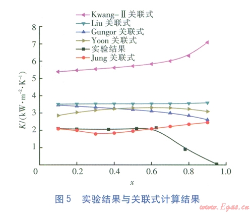 筆者選取5種經(jīng)典換熱關(guān)聯(lián)式,將本次設(shè)定實驗條件(PAD油的質(zhì)量分數(shù)固定為0.75%)作為已知計算條件,比較實驗結(jié)果與換熱關(guān)聯(lián)式計算結(jié)果,從中篩選出適于計算混合物水平光滑管內(nèi)流動沸騰換熱系數(shù)的傳熱關(guān)聯(lián)式。