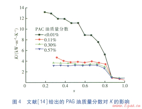 圖4與圖3類似,在低干度區(qū),C02主要以液態(tài)形式存在,對PAG油的溶解度較大,表現(xiàn)為PAG油質(zhì)量分數(shù)對K的影響很大。隨著工質(zhì)干度的增大,尤其干涸發(fā)生以后,氣態(tài)C02的比例增大,氣態(tài)C02對PAG油的溶解性很差,大部分PAG油析出,PAG油質(zhì)量分數(shù)不再是影響K的決定因素。最終,無油工況與含油工況的K趨于一致。