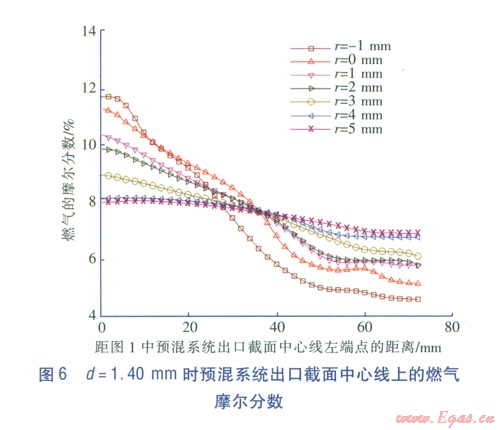 不同噴嘴直徑d 和噴嘴位置條件下,預(yù)混系統(tǒng)出口截面中心線上混合氣中燃氣的摩爾分數(shù)見圖4~6可知,當r=-1mm和r=0mm時,中心線上燃氣摩爾分數(shù)的不一致性非常明顯,摩爾分數(shù)波動范圍為4%~12%。R越大,中心線上的燃氣的摩爾分數(shù)一致性越好。當r=4mm和5mm時,中心線上燃氣的摩爾分數(shù)幾乎相同,這說明此條件下混合效果比較好。因此,為了實現(xiàn)燃氣和空氣的完全預(yù)混,取r>4mm。