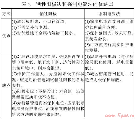 陰極保護可采用犧牲陽極法和強制電流法,兩種方法性能比較如表2: