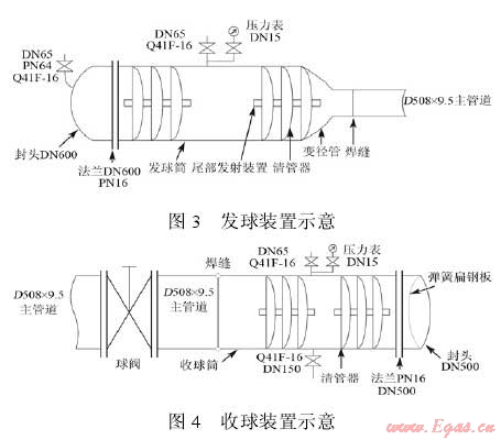管道清掃干凈后進行注水試壓,水壓試壓每段不宜超過35km,高差不宜超過30m,管道試壓注水時,宜加隔離球,且應(yīng)保持一定的球前壓力,以排除管內(nèi)空氣,試壓合格后排盡試壓水并對管道進行干燥,直至管內(nèi)空氣水露點比輸送條件下最低環(huán)境溫度低5℃,若管道封閉超過3個月未投產(chǎn),應(yīng)對管道進行充氮氣保護。下面以主管道D508×9.5為例,其發(fā)球裝置和收球裝置示意圖如下: