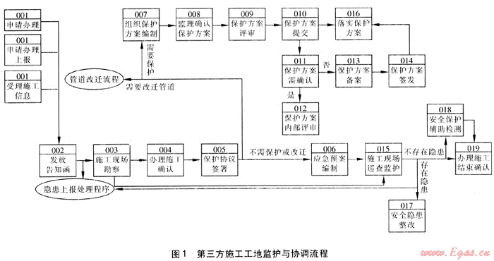 本流程包括第三方施工信息源的獲取、安全協(xié)調(diào)工作的開展、安全保護(hù)工作實(shí)施、安全保護(hù)措施的落實(shí)、安全協(xié)調(diào)保護(hù)過程的監(jiān)控等一系列工作。燃?xì)夤艿涝O(shè)施經(jīng)營管理單位參與的主要程序包括:巡查發(fā)現(xiàn)施工信息并上報、受理施工信息、發(fā)放告知函、施工現(xiàn)場勘察、辦理燃?xì)夤艿涝O(shè)施確認(rèn)、簽訂保護(hù)協(xié)議、編制應(yīng)急預(yù)案、保護(hù)方案內(nèi)部評審、保護(hù)方案備案、施工現(xiàn)場巡查監(jiān)護(hù)、安全保護(hù)檢測等。施工結(jié)束后,建立《施工工地安全保護(hù)協(xié)調(diào)檔案》。